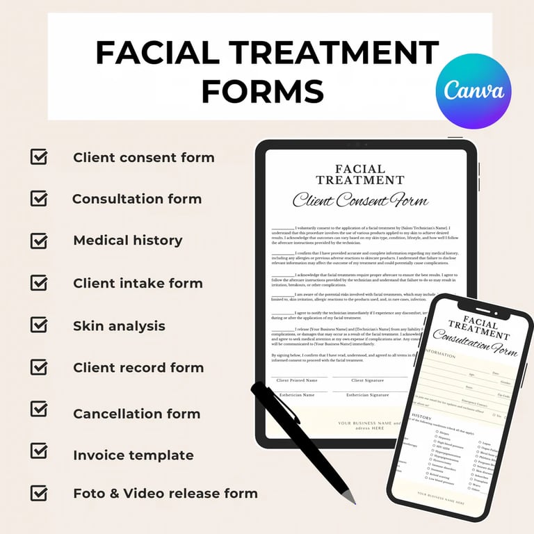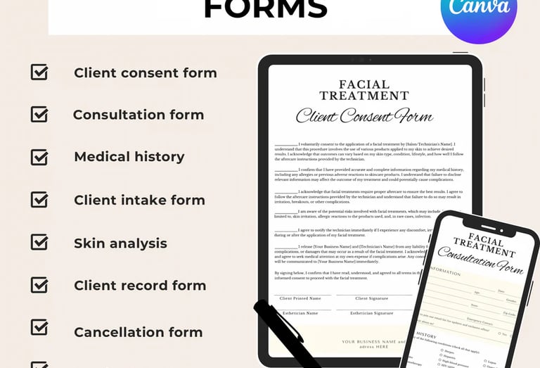 Editable Facial Consent & Client Intake Forms Bundle for Estheticians – Skin Analysis & Medical History Templates