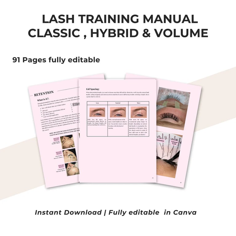 Editable Lash Training Manual | Classic, Hybrid & Volume Techniques | Canva Editable